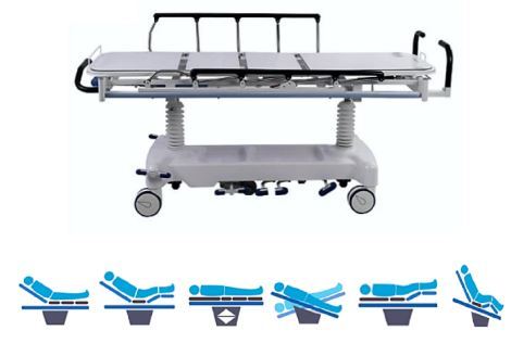 Fabricada en tubería cold rolled Acabado pintura en polvo electrostática Tendido lámina cold rolled Ruedas en poliuretano de 5" con freno de lujo para facilitar su movilidad y transporte Colchoneta 10 cm, tapizado sintético tipo cuero con espuma densidad 26 Baranda plegable pintada Movimientos: Levante de los pies mecánico y trendelemburg neumático Rango de Altura Plataforma radiolucida de 2 secciones Respaldo reclinable accionamiento manual bandeja porta placa Medidas útiles 80 cm de alto x 60 cm de ancho x 2 mt de largo Capacidad de carga 220 kilos