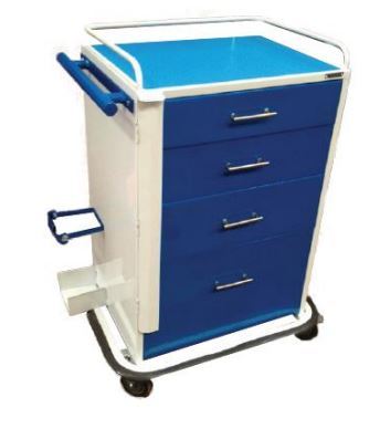 Elaborado en lámina cold rolled calibre 20 Pintura electrostática Ruedas de 4 pulgadas con freno Medidas externas totales 1.00 A x 0.60 L x 0.44 F Posee 3 gavetas de 0.10 A x 0.53 L x 0.37 F Un cajón de 0.21 A x 0.53 L x 0.37 F Base inferior con bomper protector -El primer cajón superior, incluye una bandeja de acrílico porta-fármaco, con 10 divisiones interiores y con tapa abatible transparente, especialmente para almacenar drogas, ampollas, etc Todos los cajones son desmontables para su limpieza y se ubican sobre rieles 40 cm trabajo pesado Manija aluminio Tabla de reanimación en triplex barnizado Tapa superior forrada en formalite Atril porta suero con capacidad para dos bolsas